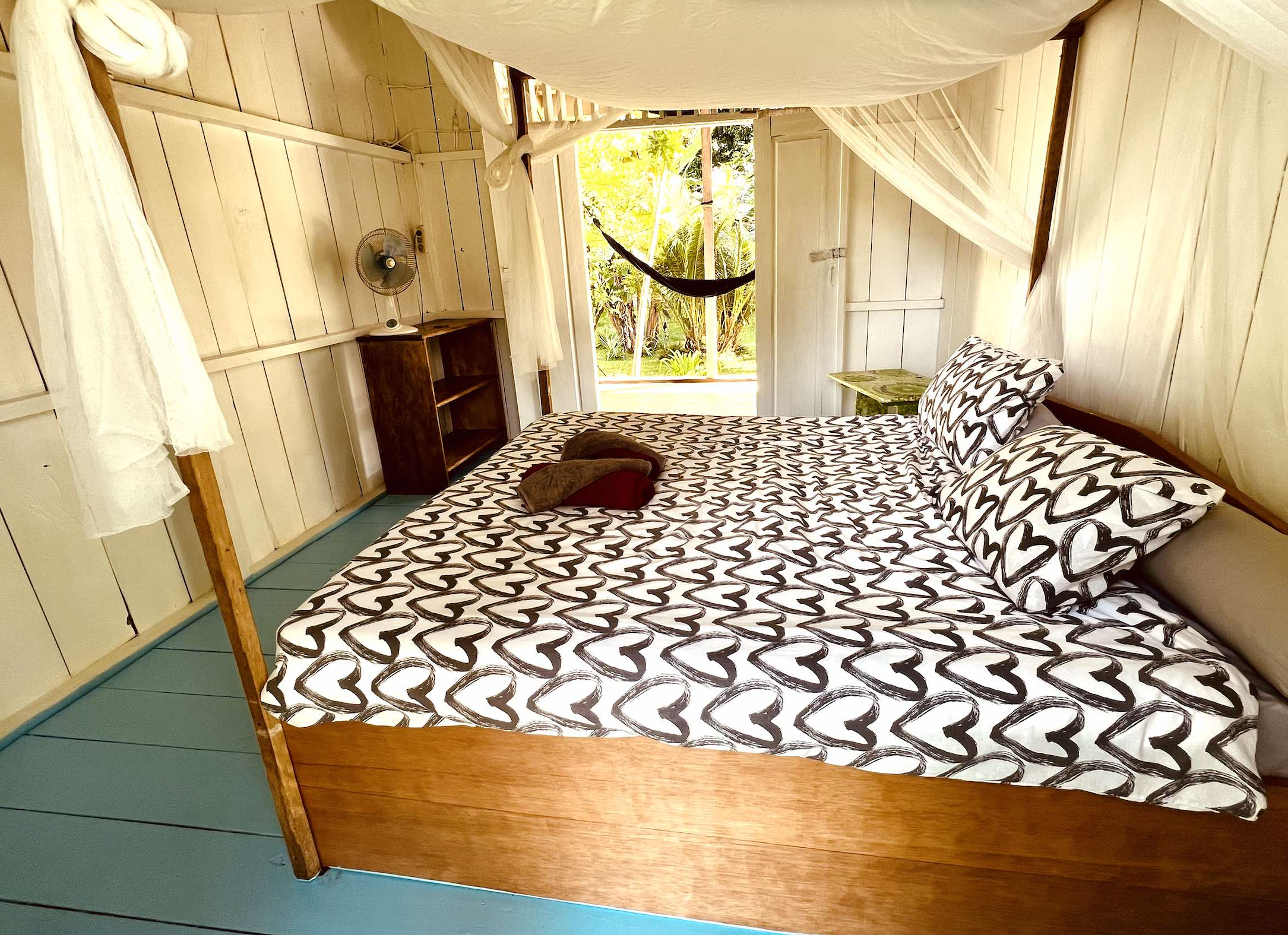 The rooms are equipped with solar-powered electrical sockets, mosquito net around the bed, a fan, and a nice balcony with a hammock and a great view!